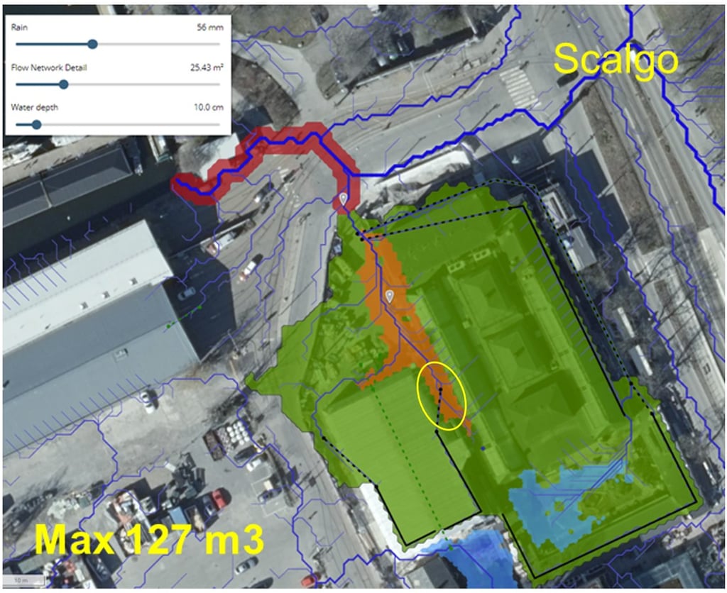 Stormwater and cloudburst investigations, modelling, mapping, and mitigation solutions for two public properties. Project for Stockholm City.