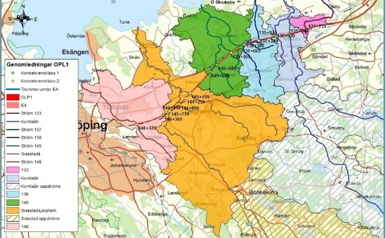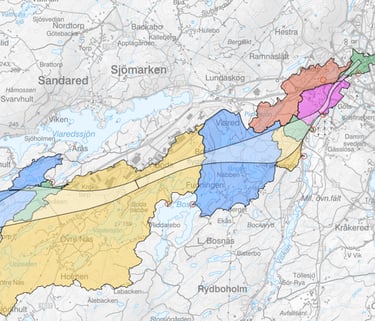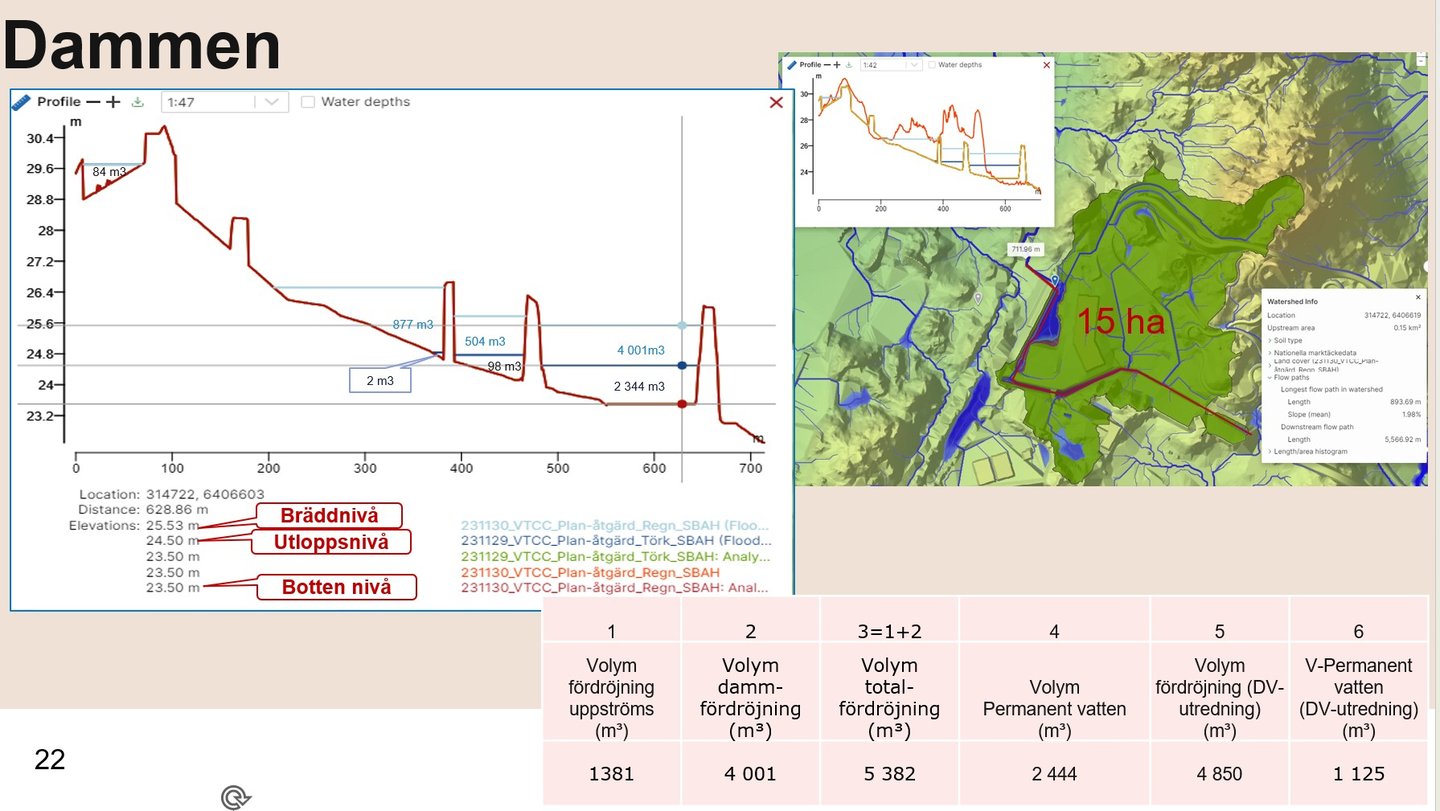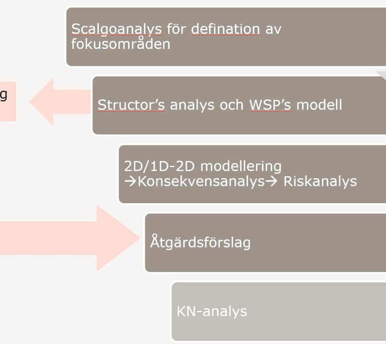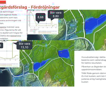 Dam safety analysis for the Kasarna and Björid dams, including upstream river and basin systems as well as downstream systems. Developed 10 consequence scenarios for mean flow (MQ) and 200-year flood events (HQ200). Hydrodynamic modelling performed in MIKE+ over an area exceeding 100 km² using a coupled 1D–2D model.