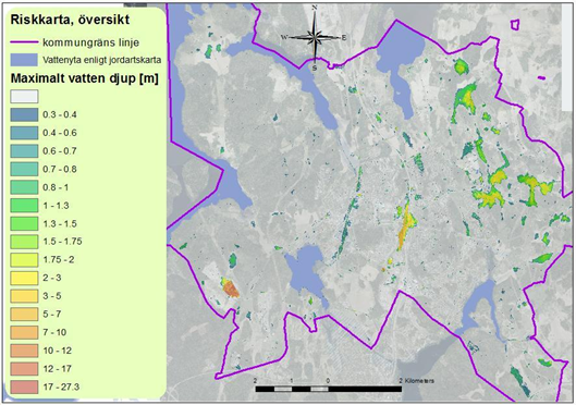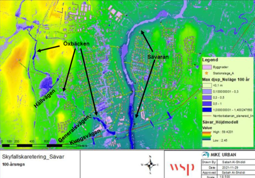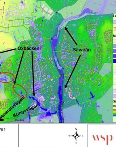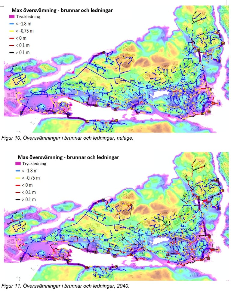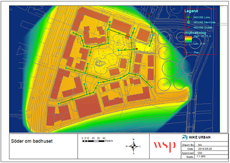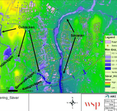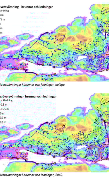 Flood and cloudburst modelling for 10-, 30-, and 100-year events. Defined responsibility distribution between Stockholm City and Stockholm Water and Solid Waste Utility (SVOA).